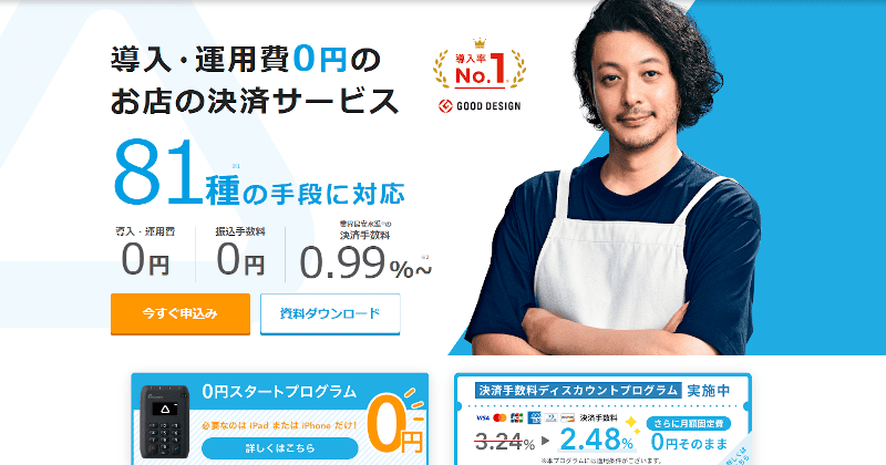 Airペイの決済手数料は1.08%~3.24%と業界最低水準となっています。