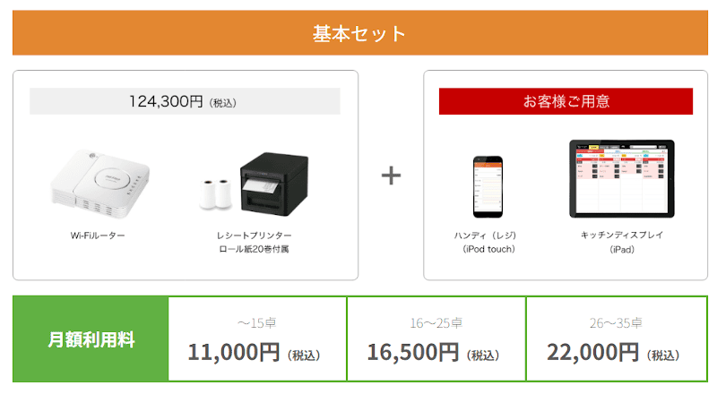 一方機器の導入サポートを依頼する場合は、機器(Wi-Fiルーター・レシートプリンターなど)の購入費用として124,300円(税込)の初期費用が発生します。