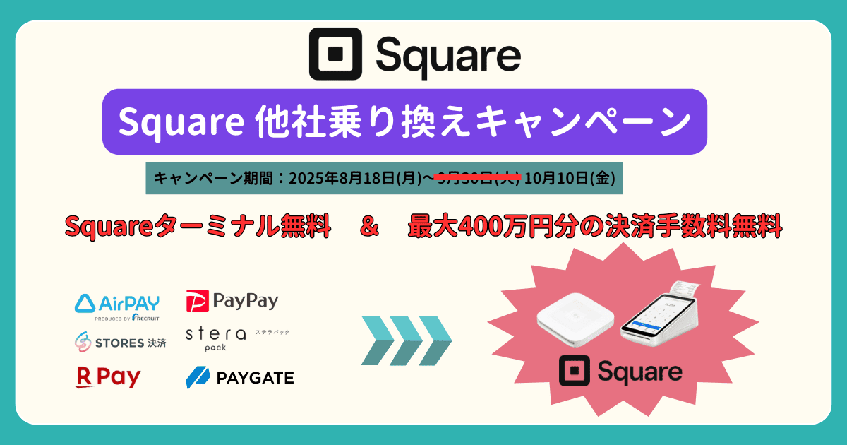 Square(スクエア)では、2025年8月18日(月)~10月10日(金)の期間中、他社からの乗換コスト0円&決済端末がもらえる他社乗換キャンペーンを実施中です。